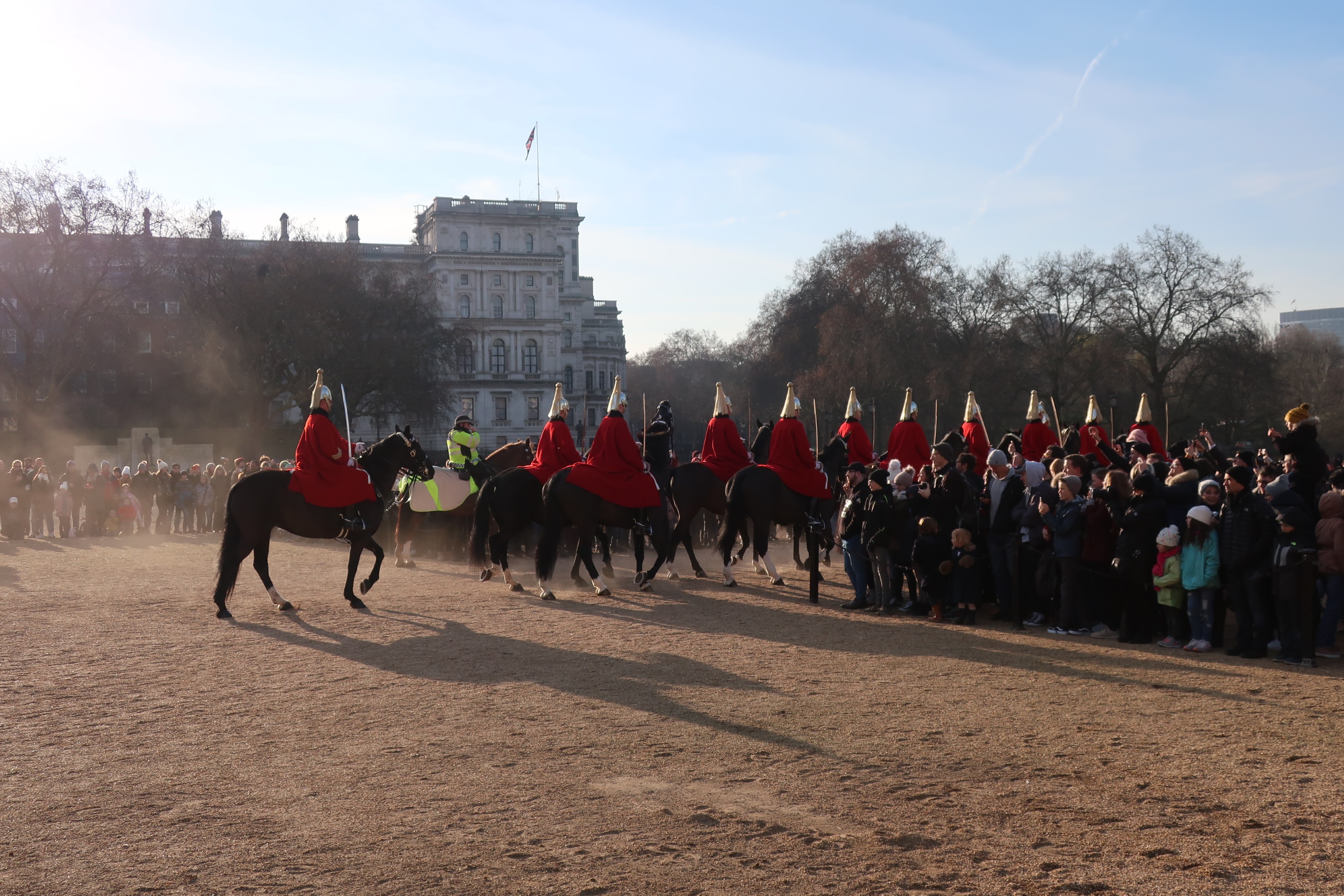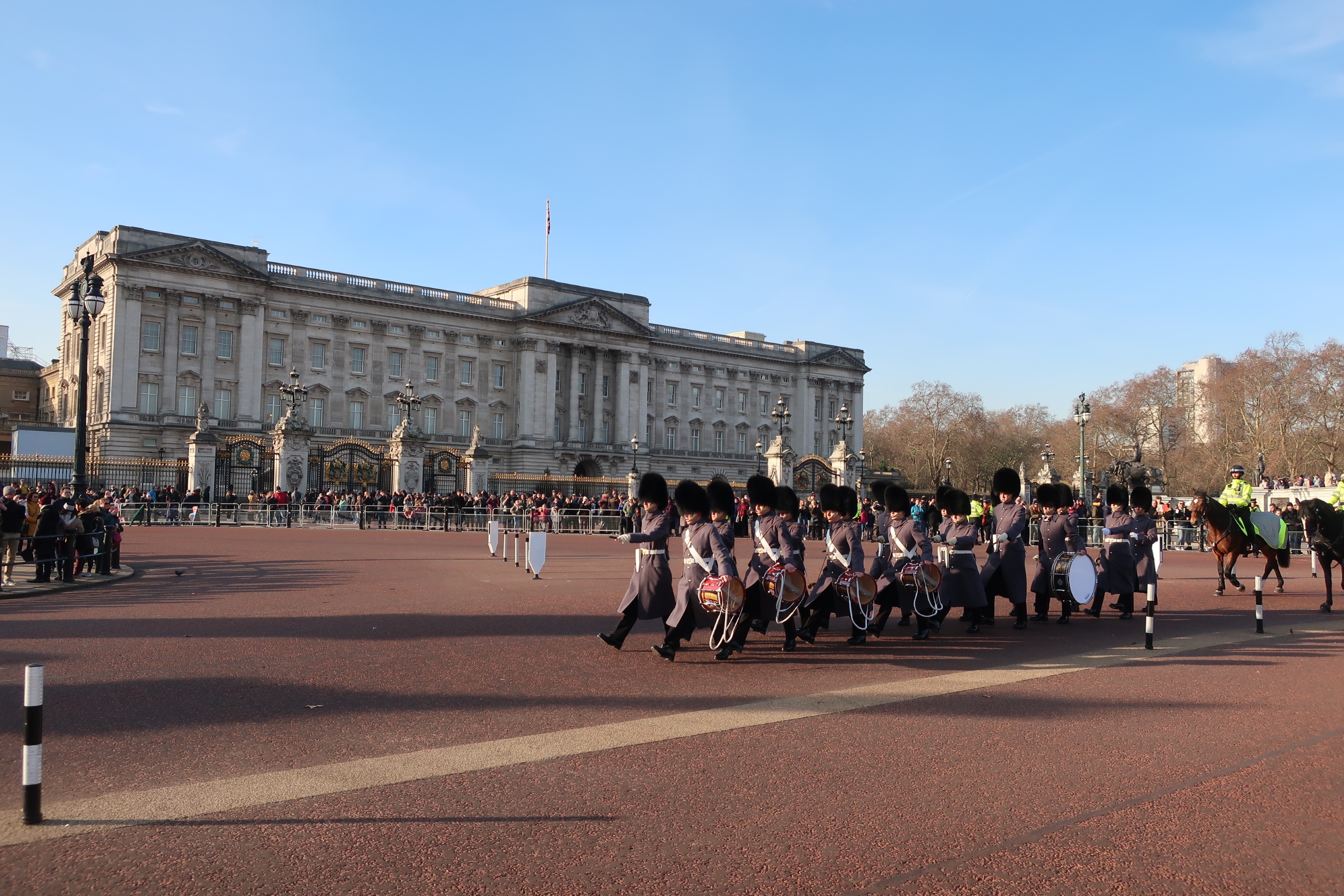 Wachablösung am Buckingham Palace durch die Queen's Life Guard bei schönstem Sonnenwetter.