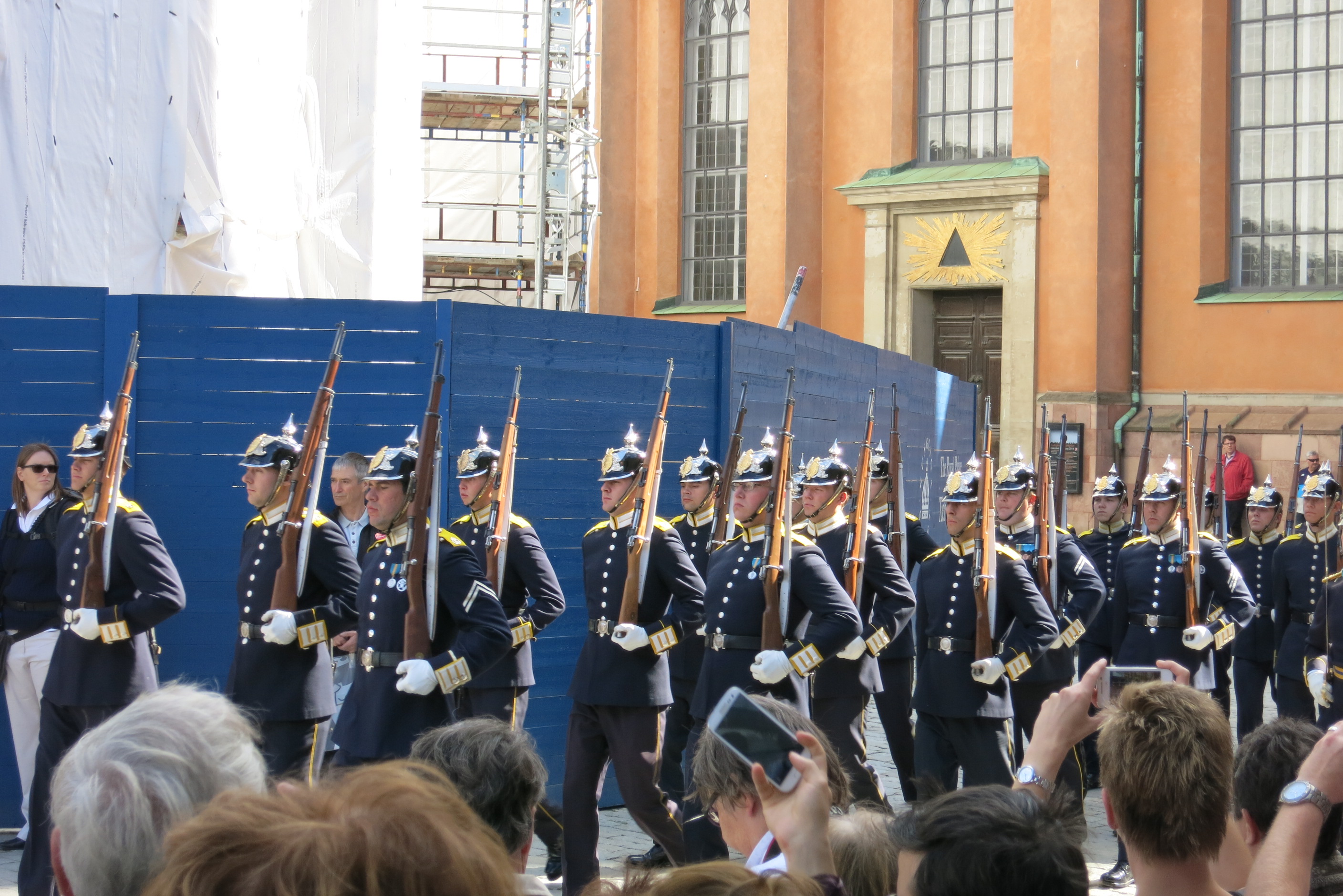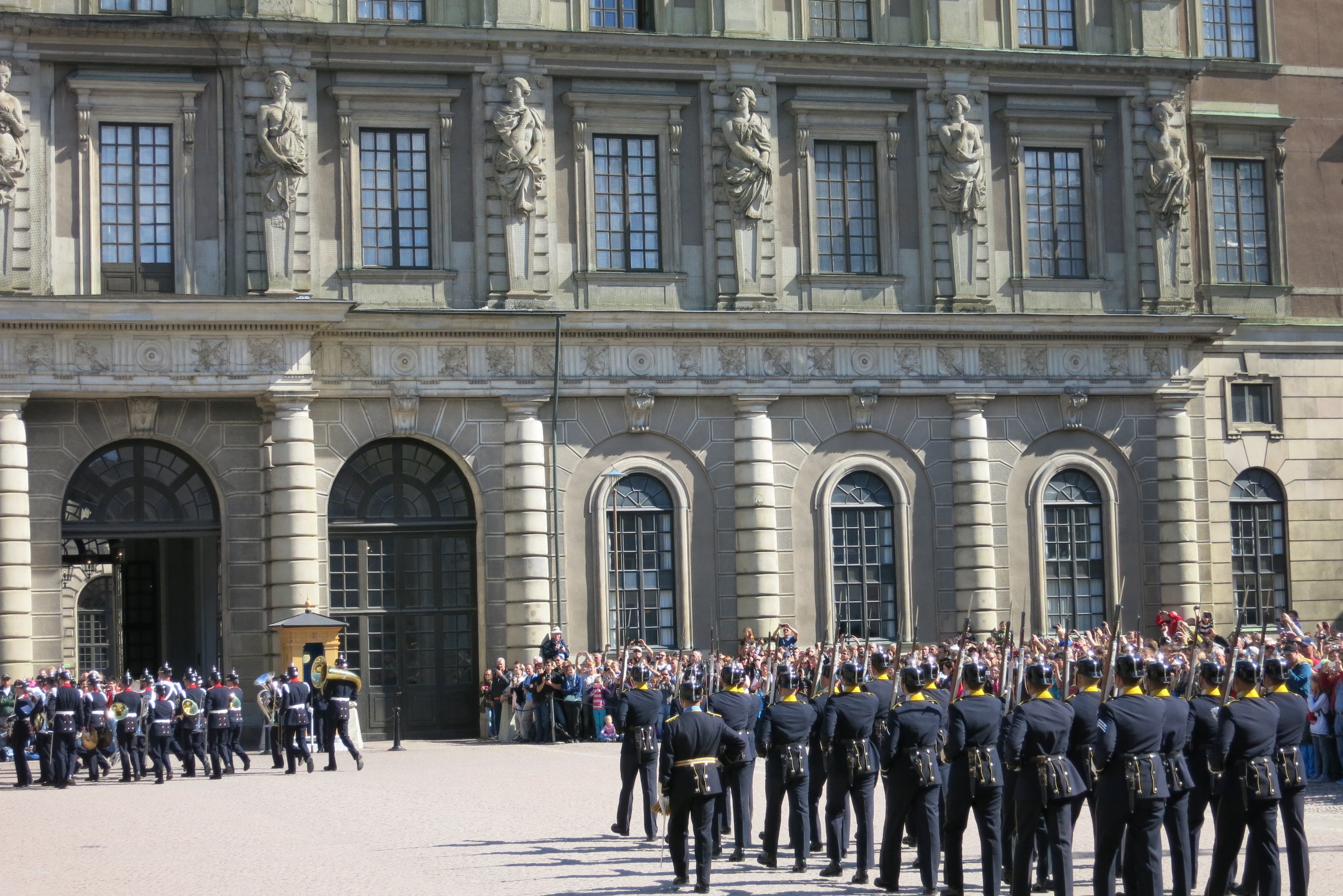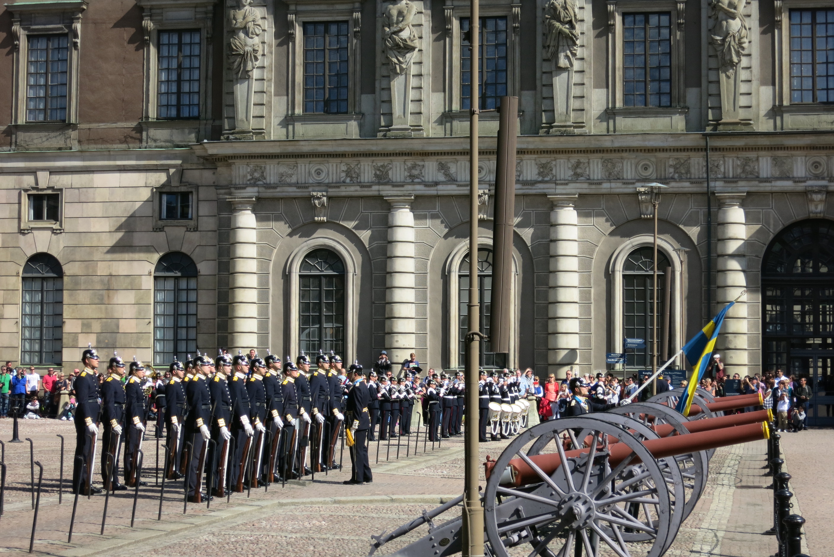 Wachablösung der Königlichen Garden vor dem Stockholmer Schloss im August mit Marsch durch Stockholm.
