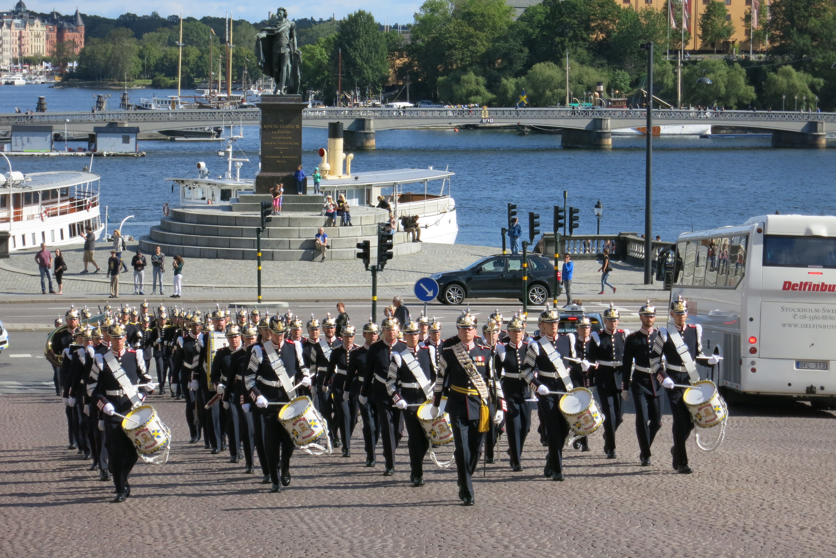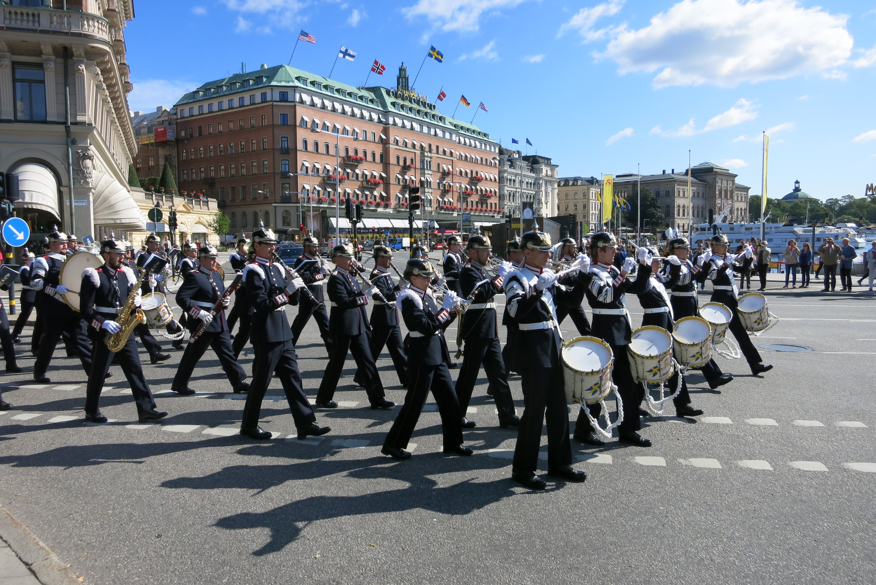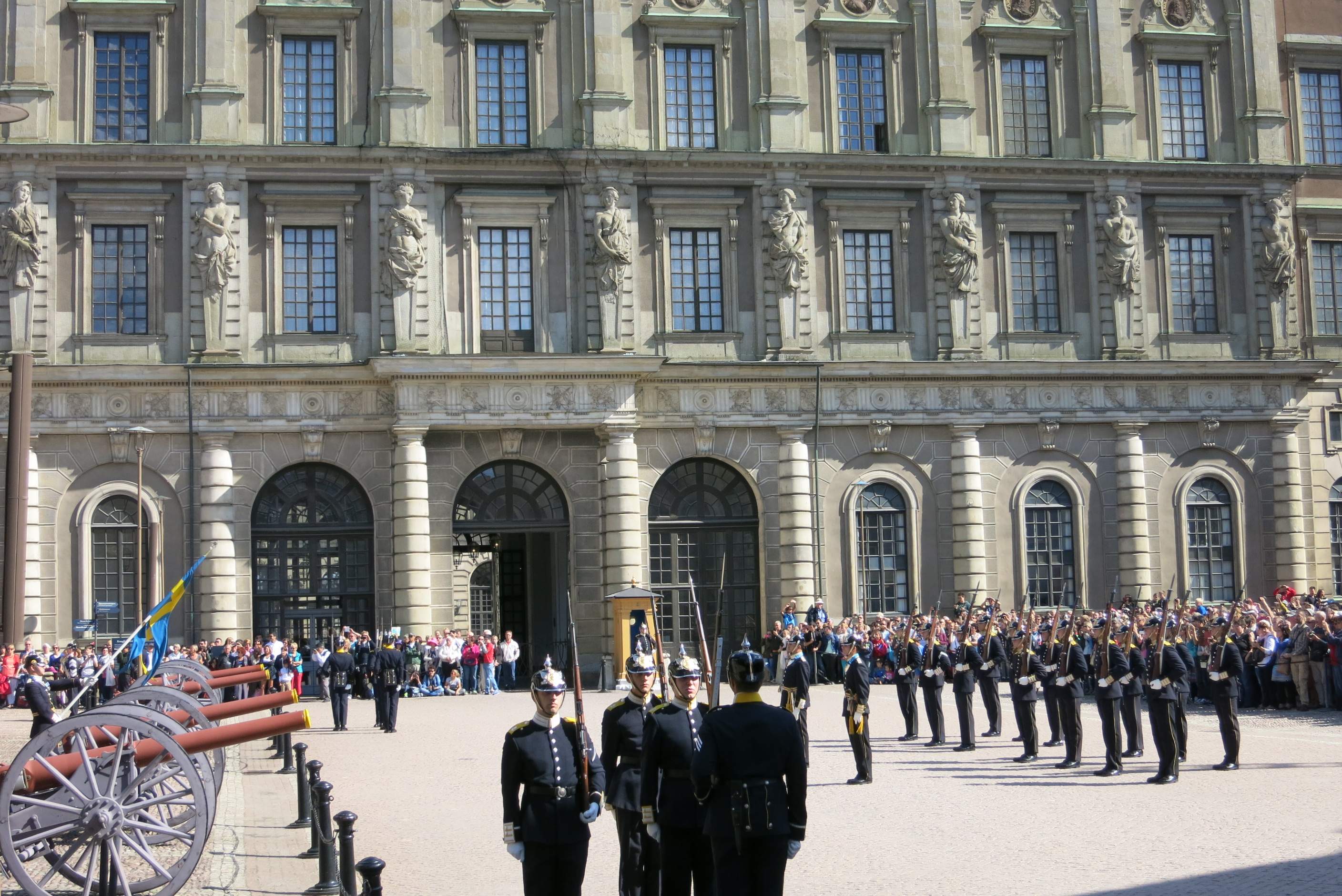 Wachablösung der Königlichen Garden vor dem Stockholmer Schloss im August mit Marsch durch Stockholm.